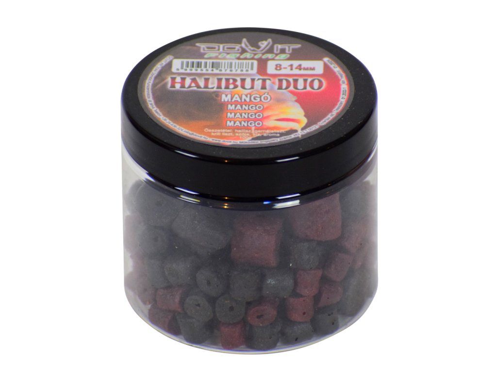 Halibut Duo je selektívna návnada s tvrdou štruktúrou, ktorú efektívne využijete predovšetkým pri love kaprov a jeseterov. Pre vysoký obsah rybej múčky, rybieho tuku a ďalších minerálnych látok ho uprednostňujú aj kapitálne ryby. Doba jeho rozpúšťania závisí vo veľkej miere od teploty vody a do každej škatuľky sme umiestnili dve pelety rôznych veľkostí. V každej krabičke nájdete halibuta čierneho aj červeného.
